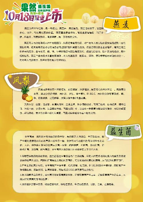 果然+凤梨燕麦酸奶上市,重磅推出多重好礼,在居民奶市场,凡在2016年10月18日-12月31日期间,连续订饮果然+凤梨+燕麦风味发酵乳满61天的饮户均可获得枣杞养心奶5杯,多订多送!在高校学生市场,在2016年10月18日-12月31日期间,连续订饮果然+凤梨+燕麦风味发酵乳满60天的高校学生均可获得品牌香皂2块,多订多送!