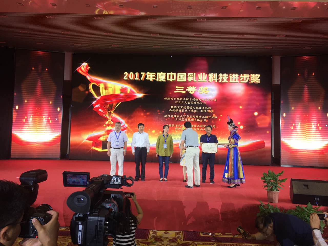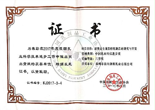 8月25-27日,中国乳制品工业协会第二十三次年会全体代表会议暨第十七次乳品技术精品展示会于在“中国乳都”呼和浩特市隆重召开。 26 日晚,“2017 年度中国乳业科技系列奖项颁奖晚会”成功举办,会上颁发了“中国乳企领军企业”、“中国乳业科技进步奖”、“中国乳业技术发明奖”、“中国乳业优秀新产品奖”、“中国乳业科技卓越青年”等多个奖项。扬州市扬大康源乳业有限公司申报的“新型益生菌发酵乳制品的研究与开发项目”获“中国乳业科技进步三等奖”,这是江苏乳业在本次年会上唯一获得的科技进步奖项。