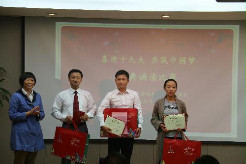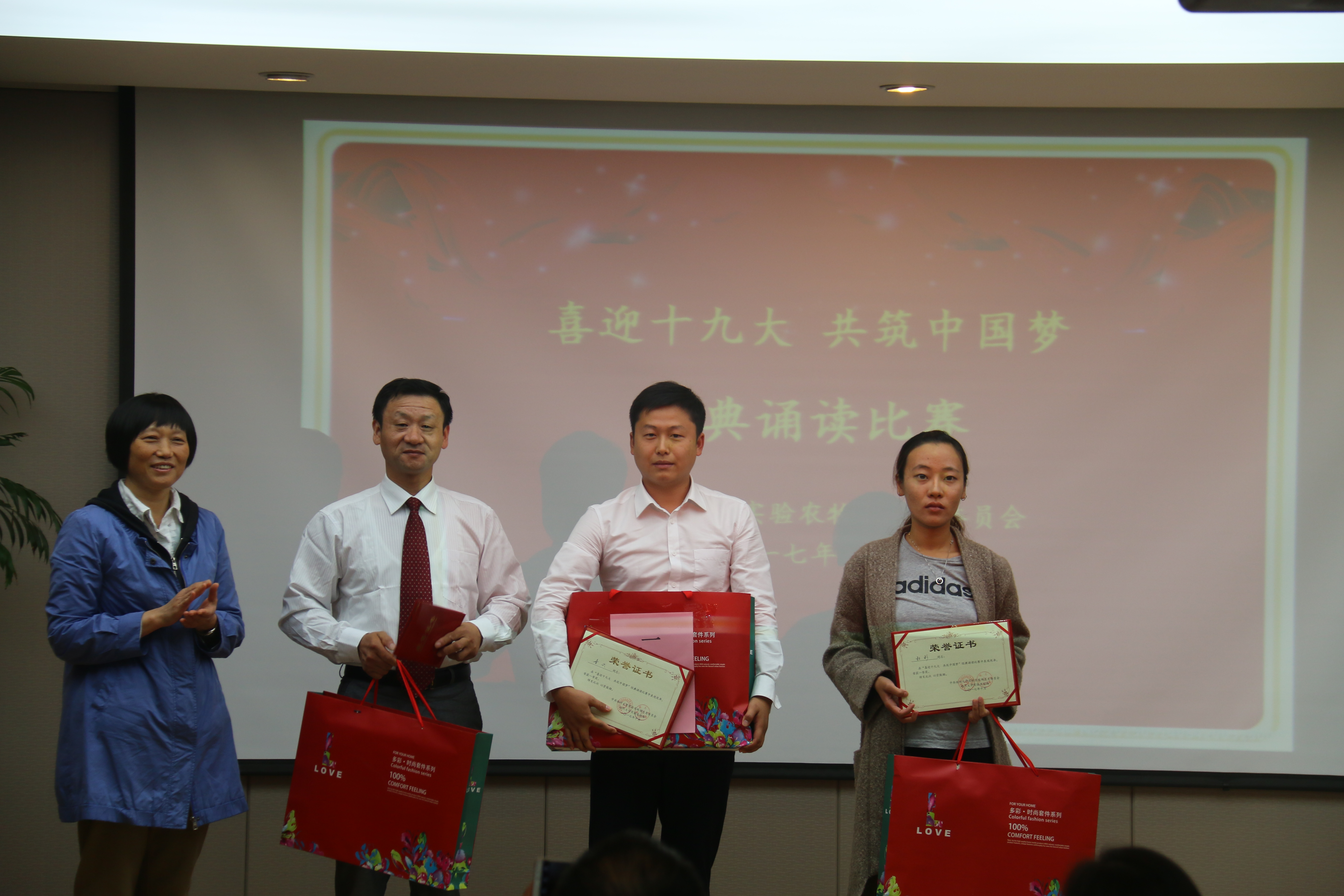 为迎接中国共产党第十九次全国代表大会的召开,9月至10月,我场举办“喜迎十九大 共筑中国梦”经典诵读比赛,经过两场预赛,产生20组选手进入决赛,决赛中各参赛选手拿出饱满热情参与比赛,经过角逐,销售部戴建根朗诵的《春江花月夜》取得第一名获得特等奖,另外还产生一等奖3名,二等奖6名,三等奖10名。本次比赛特别邀请校党委委员、工会主席高远,校组织部副部长赵春丹,校宣传部副部长姚永明作为评委。这次比赛的成功举办,对弘扬中华传统文化,促进农牧场文化建设,宣传爱国主义精神,增强广大职工的民族自豪感和凝聚力,起到了较好的促进作用。