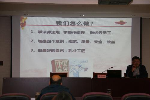 扬州市广陵区市场监督管理局食品安全监管科崔生明科长作《食品安全法律法规和企业员工行为规范》的专题讲座。崔科长理论联系实际,从企业员工的角度,对常用的法律、法规、规章、标准、文件等进行解读。崔科长重点对《食品安全法》、《食品生产许可管理办法》、《食品安全国家标准乳制品良好生产规范》等内容做详细解读。