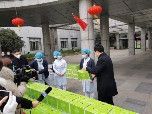 2月6日上午,在校党委常委、副校长费坚,校党委常委、副校长刘巧泉带领下,我场林建群场长、房东升书记和印伯星副场长来到扬州大学附属医院,为奋战在抗击疫情一线的医护人员送来了温暖,爱心捐赠价值5万元的扬大牛奶,并对一线医护人员进行了慰问。扬州大学附属医院党委书记王炜、扬州大学附属医院院长殷旭东代表全院医护人员接受了捐赠。