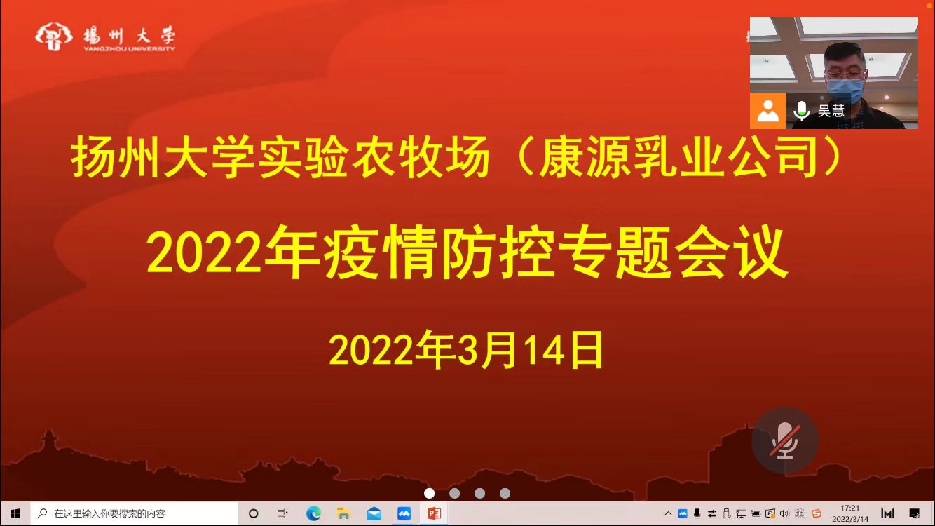 3月14日下午,我场通过视频会议形式召开全场2022年疫情防控专题会议,传达学习习近平总书记关于疫情防控的重要指示精神和党中央、国务院决策部署,学习贯彻省市疫情防控工作要求,学习学校疫情防控工作重点。林建群场长主持会议。