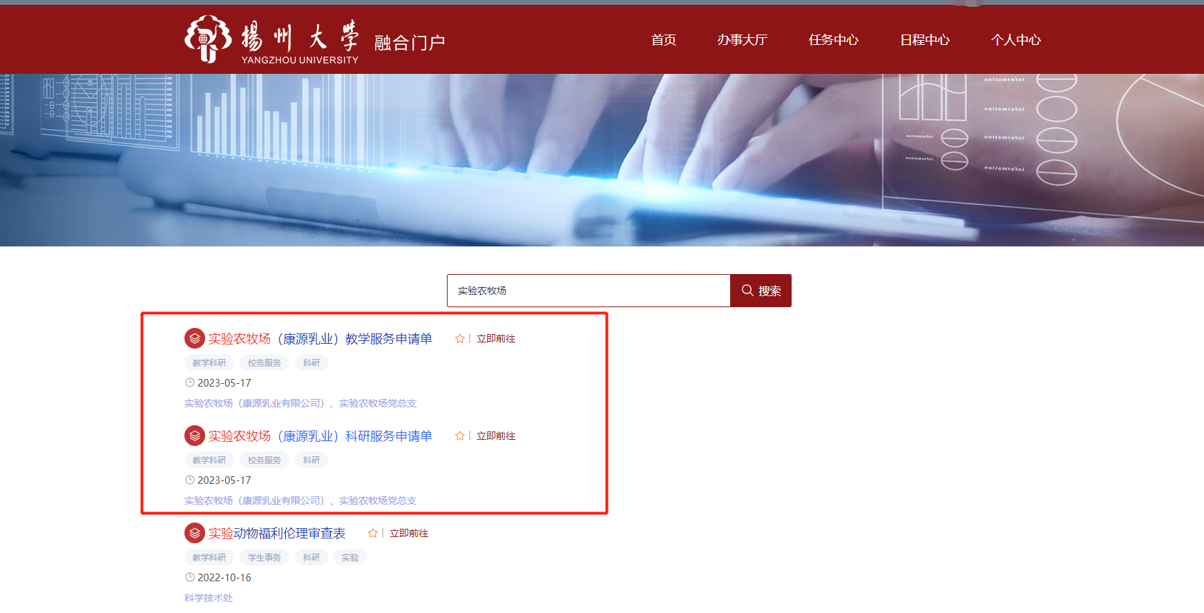 第一步:进入融合门户(i.yzu.edu.cn),点击“办事大厅”,搜索“实验农牧场”——找到“实验农牧场(康源乳业)教学服务申请单”和“实验农牧场(康源乳业)科研服务申请单。