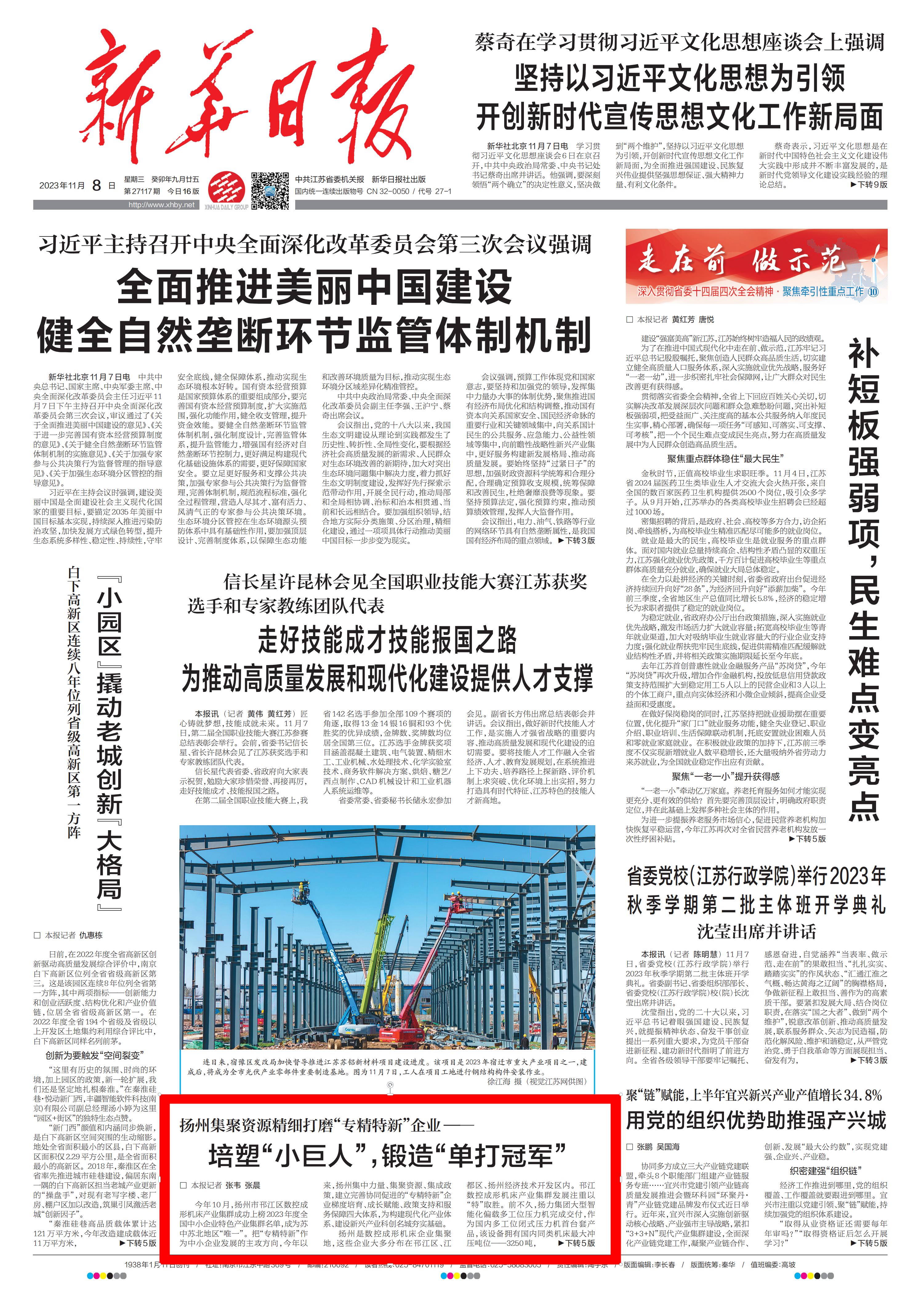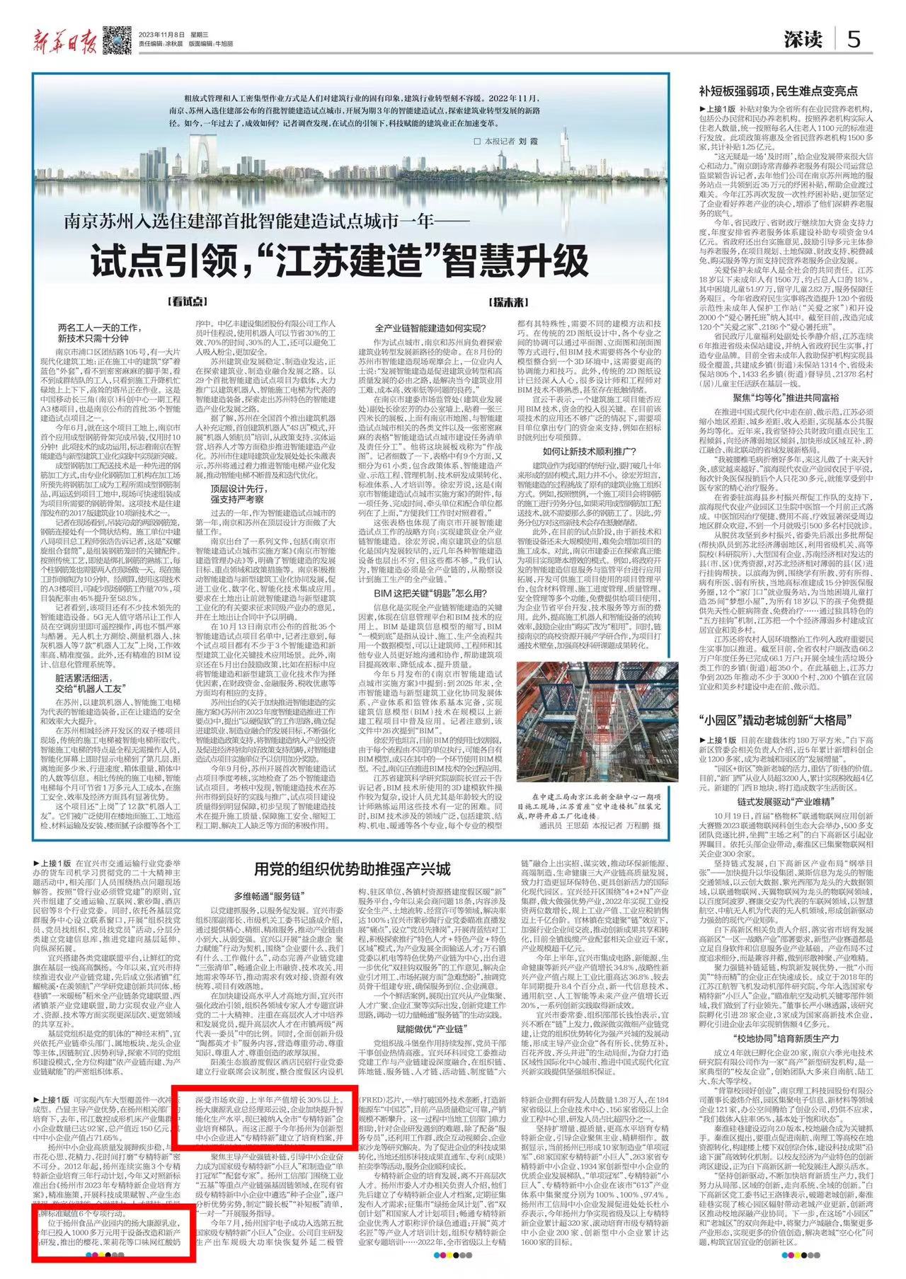 11月8日,新华日报以《培塑“小巨人”,锻造“单打冠军”》为题,报道我场康源乳业有限公司“专精特新”工作。