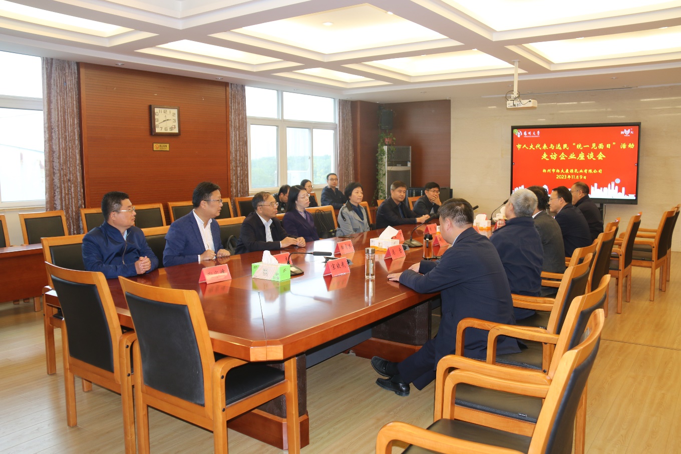 11月9日下午,市人大代表与选民“统一见面日”活动走访企业座谈会在我场举行。市人大代表、扬州市委市级机关工作委员会书记、一级调研员王涛,市人大代表、扬州市人大常委会环境资源城乡建设工作委员会、二级调研员周蕾,市人大代表、江苏扬建集团有限公司总经理、总工程师邹厚存,市人大代表、扬州市市政建设处总工程师曹勇出席座谈会。汤汪街道党工委书记兼东南新城党工委书记姜志,汤汪街道人大工委主任谢家峰,食品产业园党委副书记、管理办副主任陈沿明陪同参加。