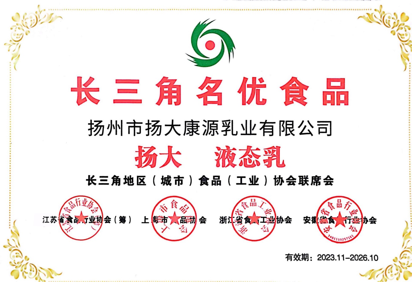 11月28-29日,由沪苏浙皖四省市食品协会联合举办的“品牌聚力·共创未来”2023年度长三角名优食品品牌峰会暨颁奖大会在江苏南京举行。会上,我场康源乳业有限公司“扬大液态乳”获颁“2023年长三角名优食品”称号。