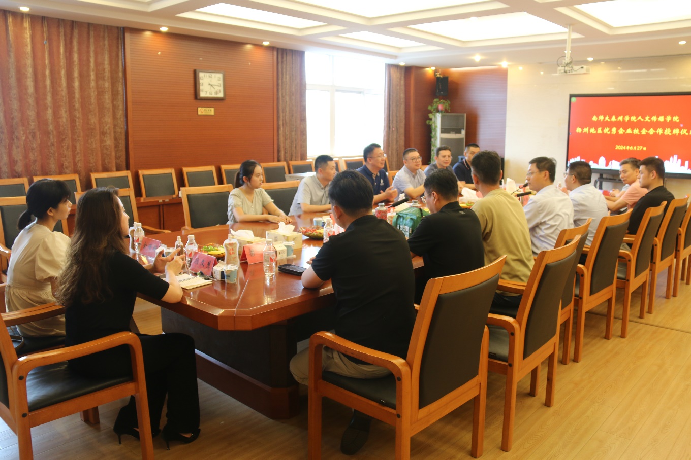 汤振纲、陈敏分别向与会领导、企业负责人介绍南师大泰州学院人文传媒学院发展情况。扬州造物熊文化传媒有限公司董事长闫立文、江苏亚联农副产品有限公司董事长姜砚野、扬州日顿食品实业发展有限公司董事长黄小晖、江苏奥特隆新材料有限公司总经理钱刚、江苏维扬豆制品有限公司总经理梁杰、扬州美伦食品有限公司副总经理史孝玲、扬州大云食品有限公司副总经理余珊珊、豆库(扬州)餐饮管理有限公司综合部经理顾文慧、场长郑云等交流发言。各企业负责人既介绍了各自企业的历史进程、发展现状和未来规划情况,又为南师大泰州学院人文传媒学院人才培养、学科建设等工作提建议、出主意,表达了与南师大泰州学院人文传媒学院深化合作的信心。