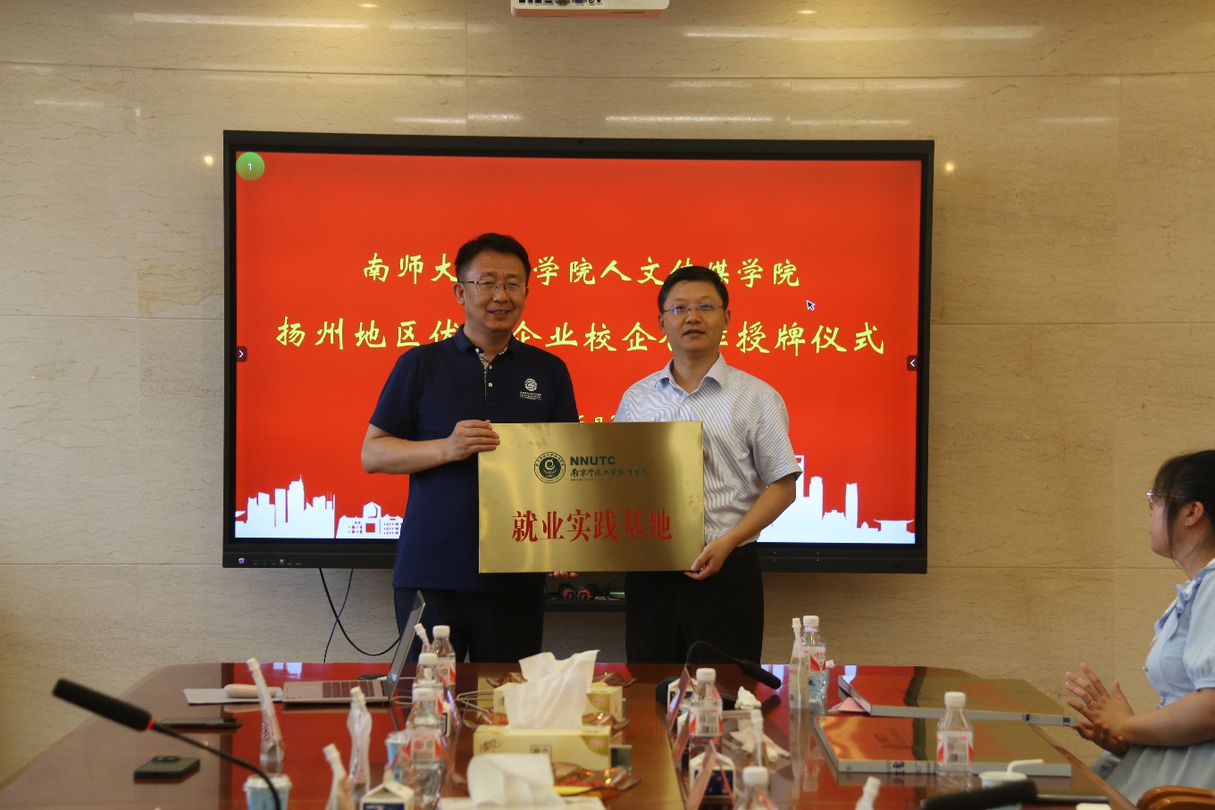 南师大泰州学院人文传媒学院为与会企业颁发就业实践基地铜牌。