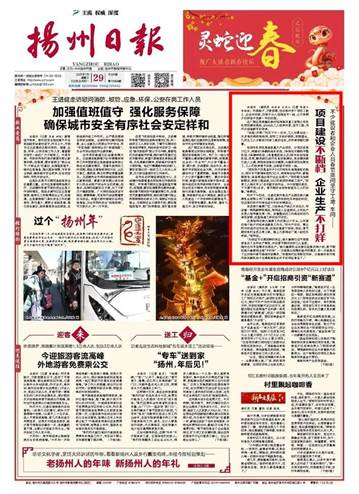1月29日,乙巳蛇年的第一天,扬州日报头版以《不少建设者和企业人员春节期间坚守工地、车间——项目建设不断档 企业生产不打烊》为题,报道了公司春节期间工作运行情况。