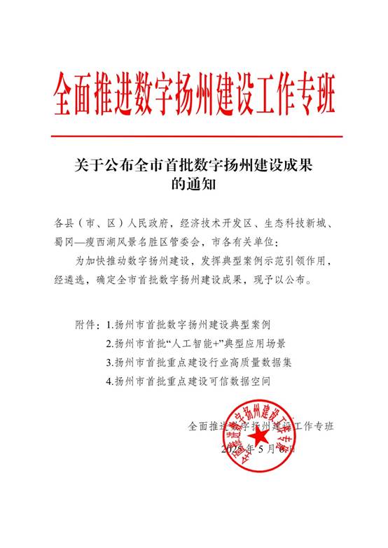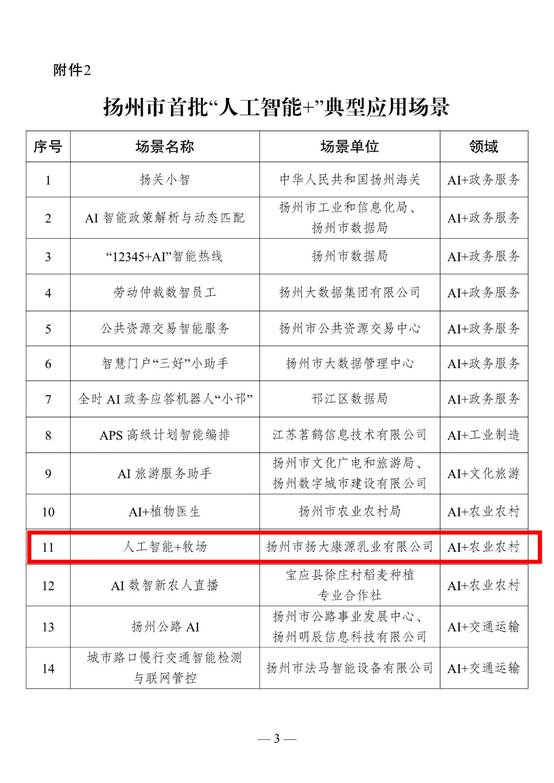 近日,全面推进数字扬州建设工作专班发布了《关于公布全市首批数字扬州建设成果的通知》,通知对入选首批数字扬州建设的各项成果进行了公布。公司“人工智能+牧场”入选扬州市首批数字扬州建设AI+农业农村领域“人工智能+”典型应用场景。