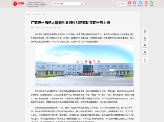 新闻链接:《江苏扬州市扬大康源乳业通过创新驱动实现逆势上扬》