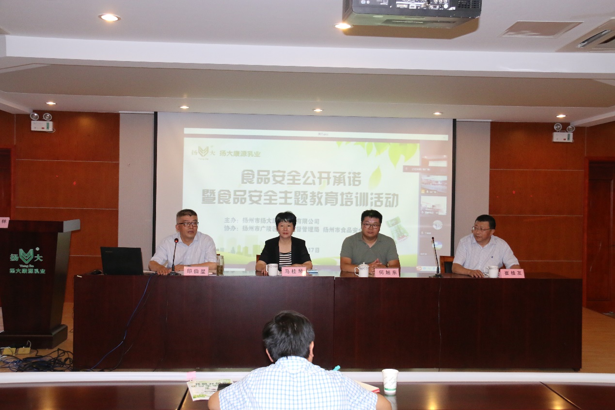 为落实习近平总书记“四个最严”要求,根据省局《关于开展食品安全“守底线、查隐患、保安全”专项行动方案通知》精神,6月17日下午我场康源乳业公司开展食品安全公开承诺暨“守查保”专项行动主题培训,布置食品安全“守底线、查隐患、保安全”专项行动。印伯星副场长主持活动。扬州市市场监督管理局何旭东主任、广陵区市场监督管理局马桂琴副局长、扬州市食品安全学会理事长崔桂友教授出席活动。