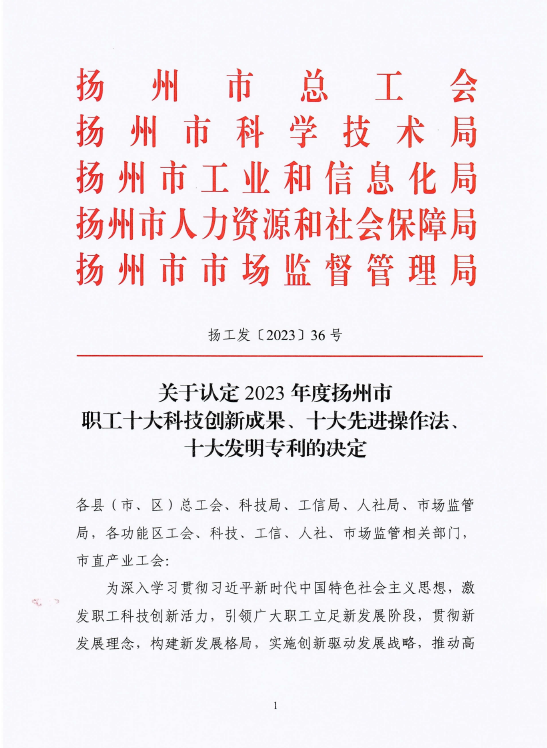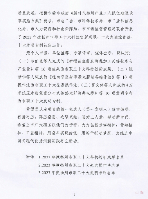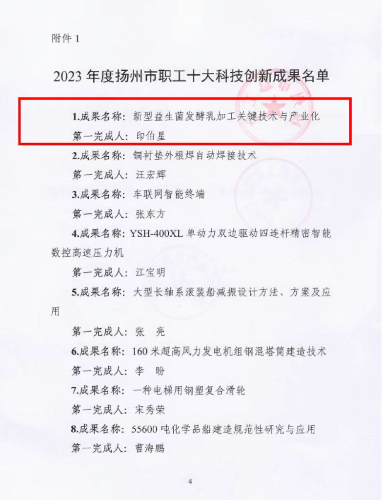 近日,扬州市总工会、科技局、工信局、人社局、市场监督局联合发布了《关于认定2023年度扬州市职工十大科技创新成果、十大先进操作法、十大发明专利的决定》(扬工发[2023]36号)。经申报、推荐、评审、公示,我场选送的《新型益生菌发酵乳加工关键技术与产业化》(完成人:印伯星、杨仁琴、徐广新、姜庆林、张宜辉、周炜)成功入选2023年扬州市职工十大科技创新成果,并在入选成果中位列第一。
