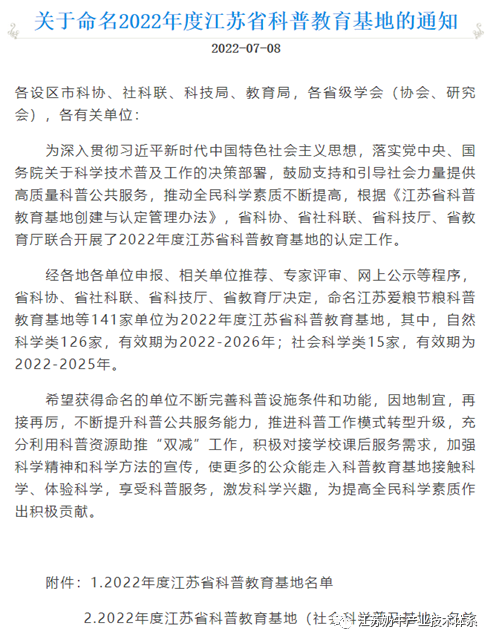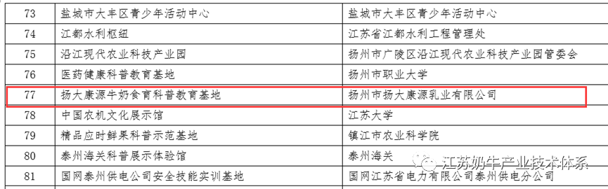 近日,江苏省科学技术协会发布了《关于命名2022年度江苏省科普教育基地的通知》,经单位申报、相关单位推荐、专家评审、网上公示等程序,省科协、省社科联、省科技厅、省教育厅决定,命名141家单位为2022年度江苏省科普教育基地。我场康源乳业公司申报的“扬大康源牛奶食育科普教育基地”名列其中,是唯一一家乳品企业入选单位。教育基地集政策宣贯、知识科普、试验示范、产业培育、三产融合等功能于一体,以“改善国民营养健康”为己任,利用基地全产业链的特色优势,积极开展牛奶营养教育示范。