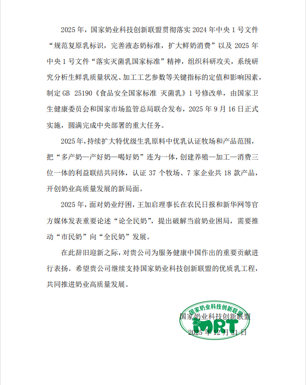 在此辞旧迎新之际,国家奶业科技创新联盟向我司发来表扬信,对我司为服务健康中国作出的重要贡献进行表扬。
