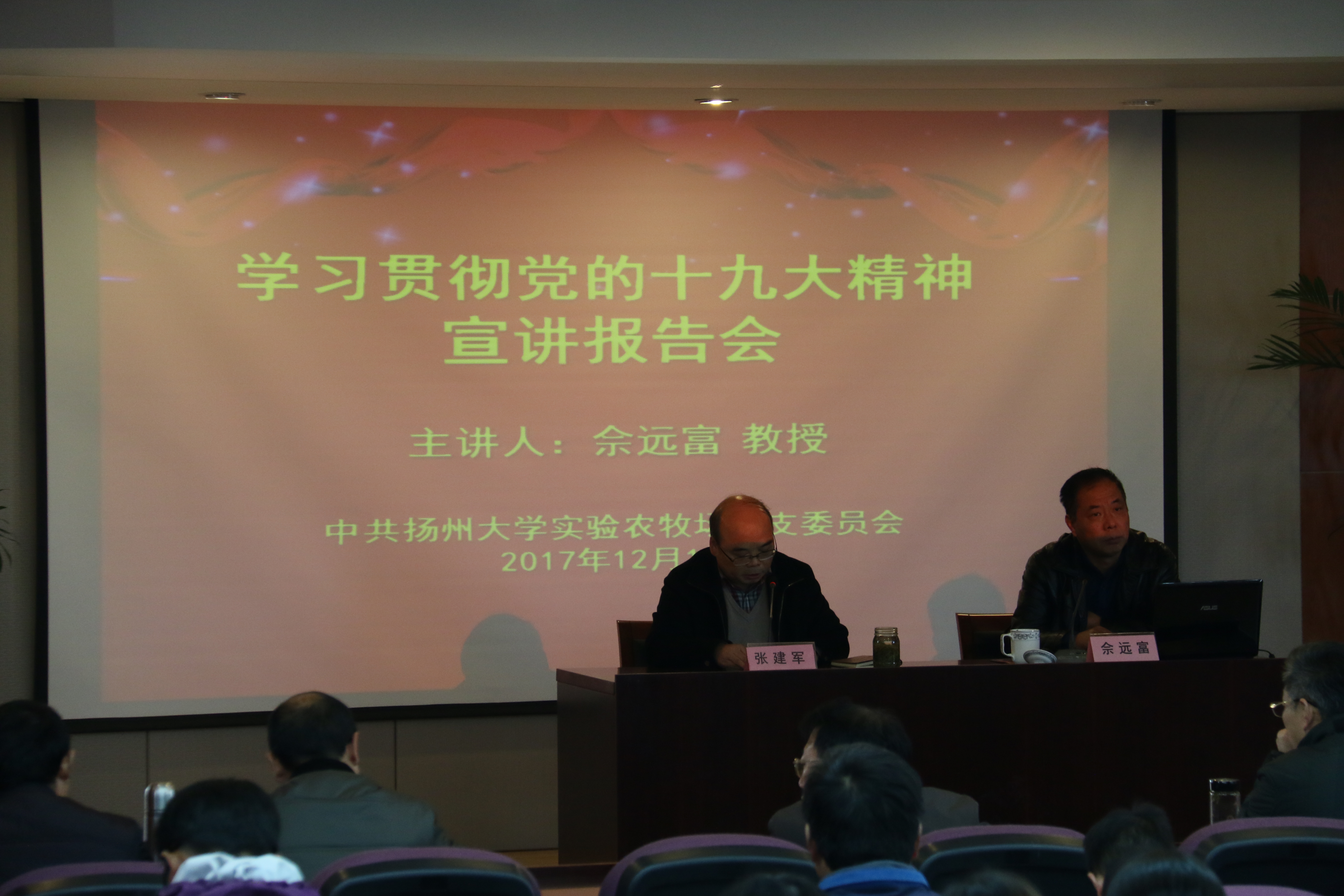 12月1日下午,我场党总支书记张建军主持召开学习贯彻党的十九大精神宣讲报告会。本次报告会邀请了校十九大宣讲团副团长、马克思主义学院院长佘远富教授作党的十九大精神宣讲。