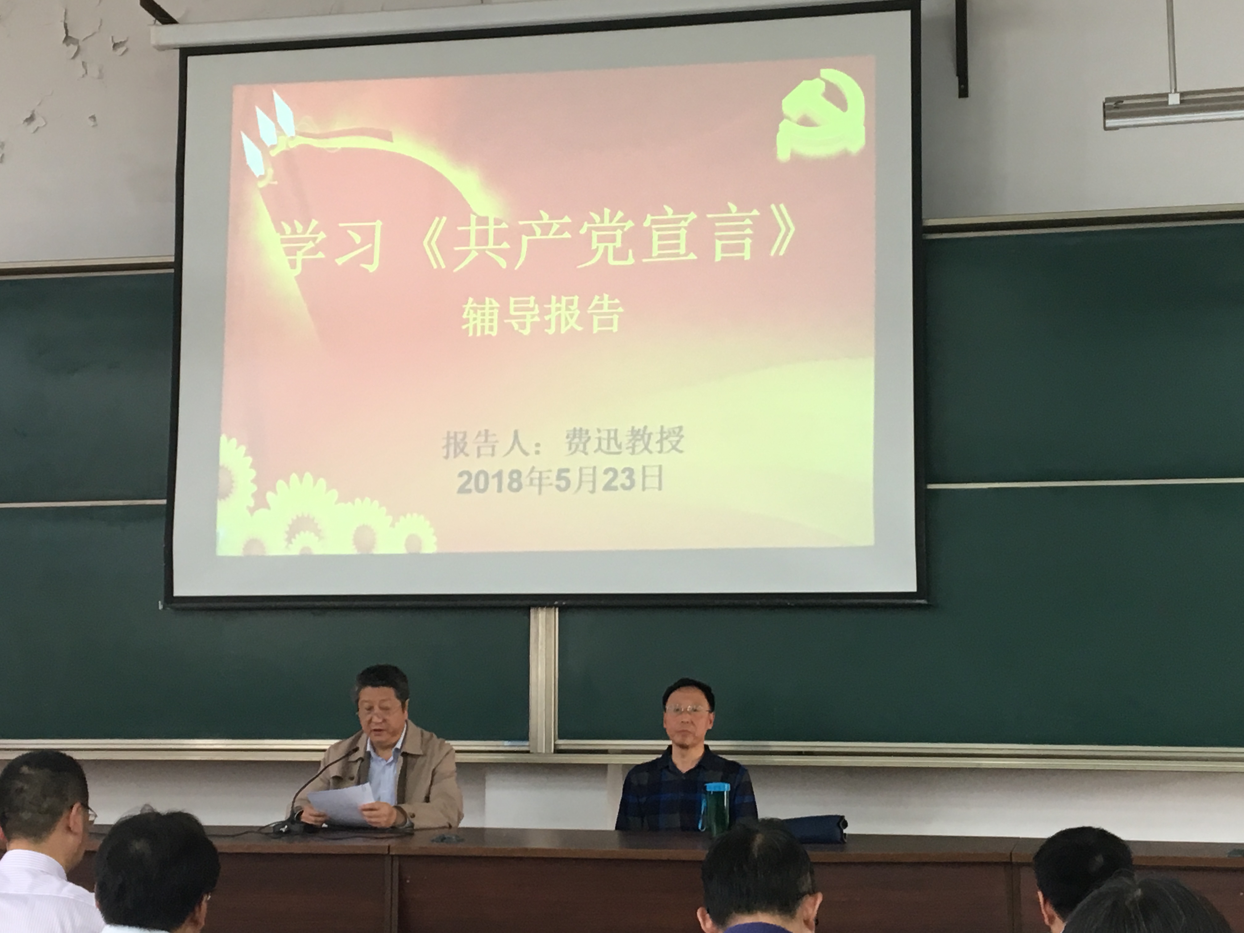 费迅教授以《狂飙一曲从天落——“创造时代”的< 共产党宣言>》为题,从《共产党宣言》的写作和发表、《共产党宣言》的理论内容、《共产党宣言》的七篇序言、《共产党宣言》与中国革命、《共产党宣言》的当代价值等五个方面,阐述了《共产主义宣言》科学阐明了共产党人的崇高信仰,深刻论证了共产主义运动的科学逻辑,奠定了马克思主义建党学说的理论基础。大家听后一致认为费迅教授的辅导报告深入浅出,通俗易懂,启发性强,具有很高的学术价值,对加强理论学习和理论武装具有很强的理论指导意义。