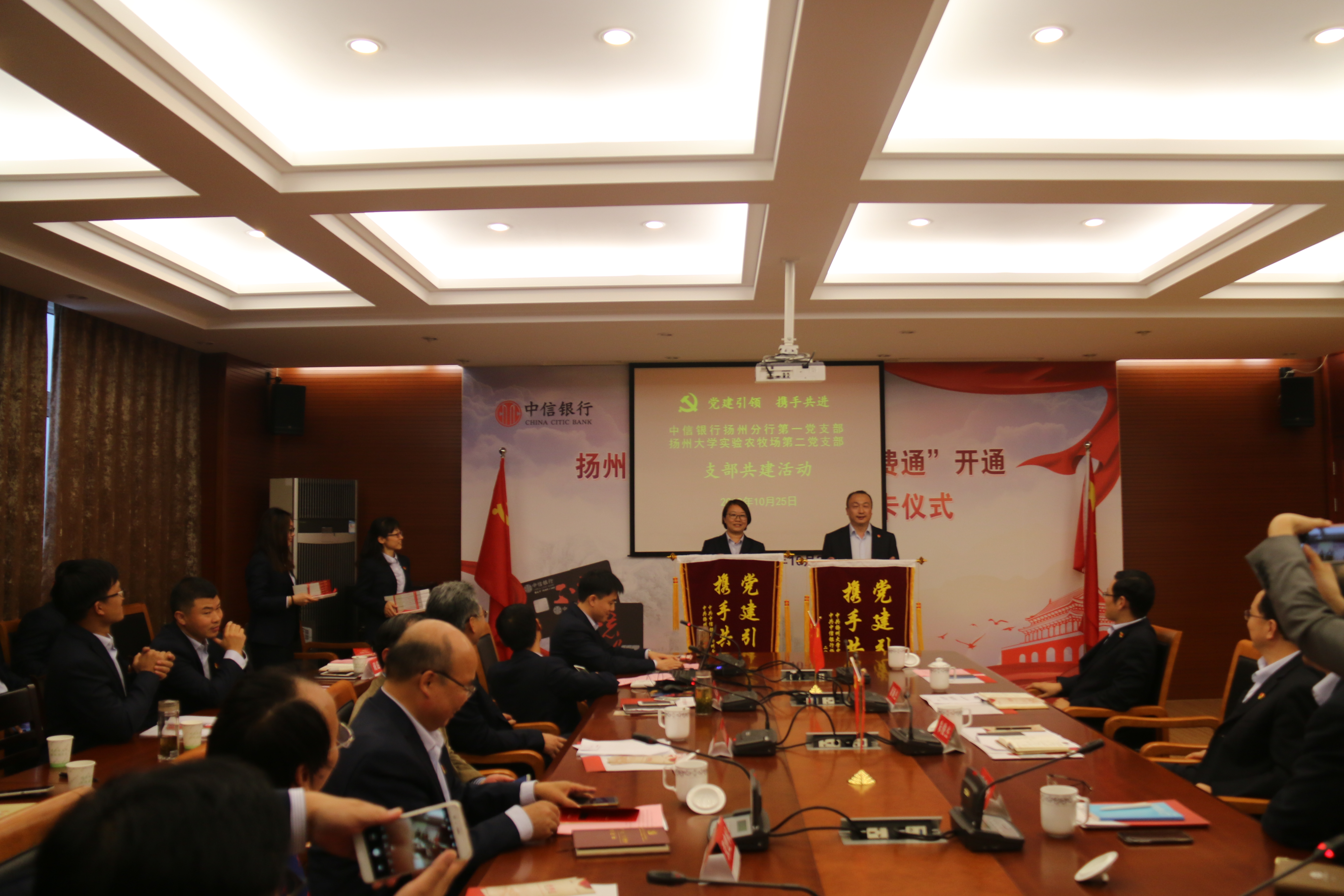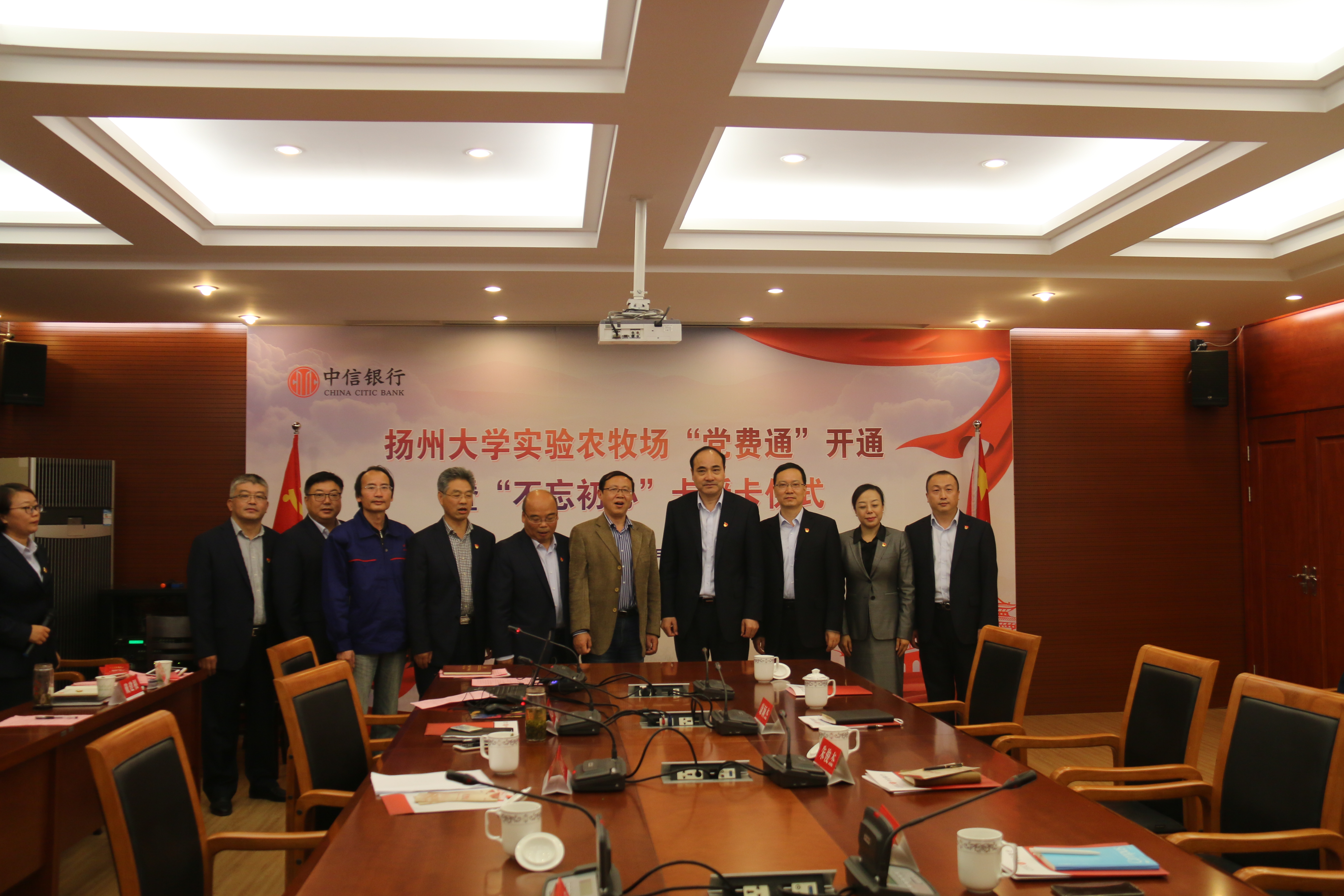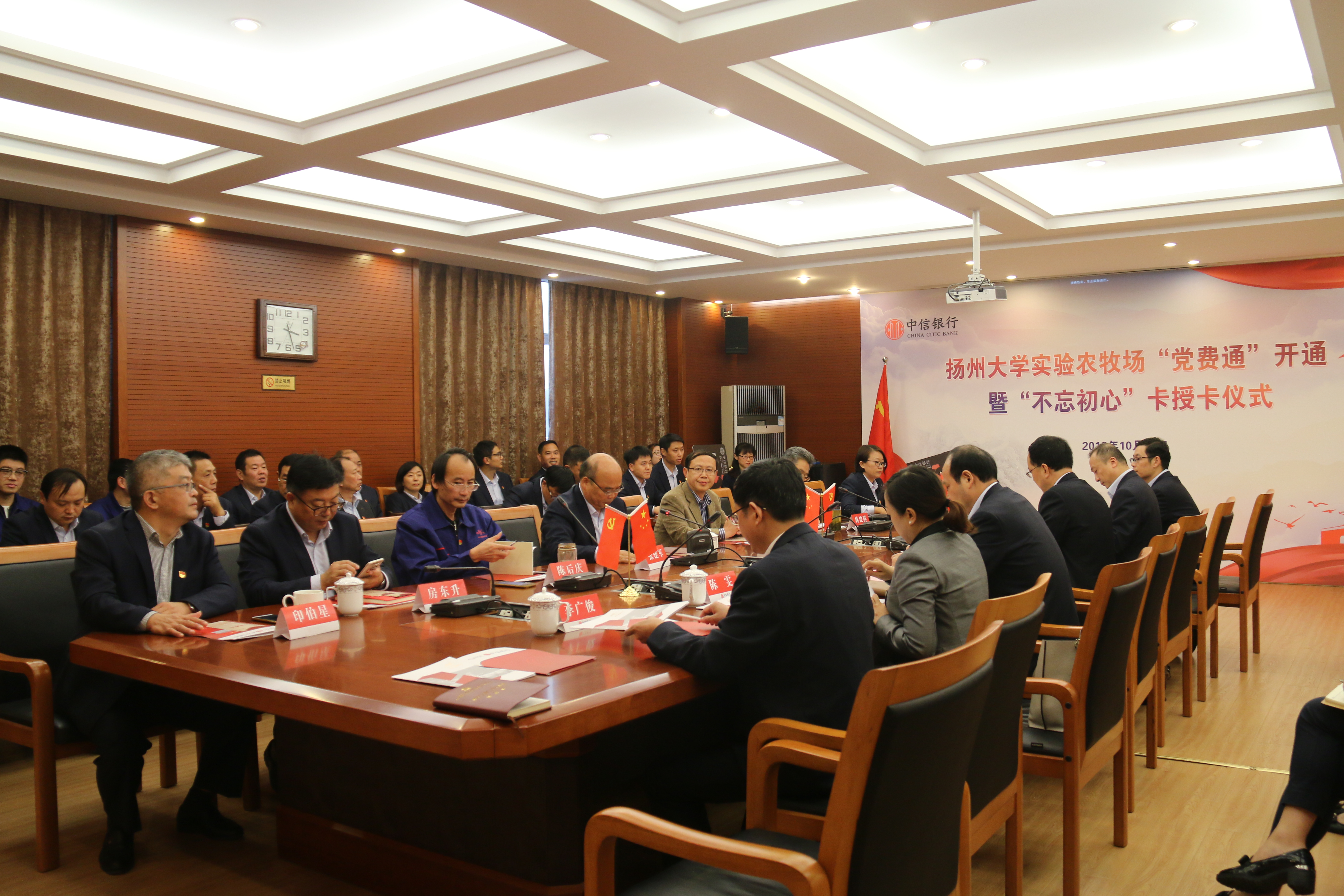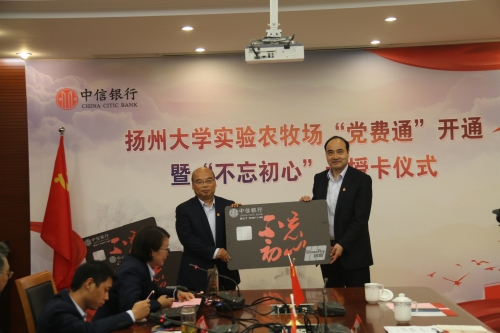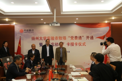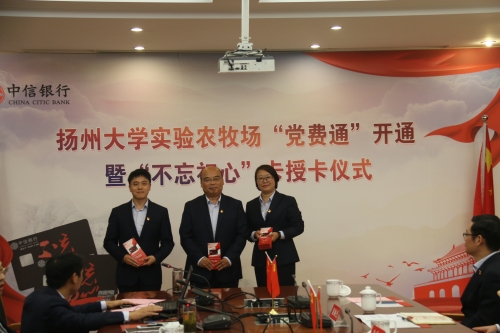 10月25日下午,实验农牧场在南场区中会议室举行中信银行“党费通”开通暨“不忘初心”卡授卡仪式,中信银行扬州分行党委书记、行长沈高升,副行长朱俊杰,南京分行电子银行部总经理助理陈雯,校党委常委、组织部长薛小平,实验农牧场领导、科长、支部书记、所有党员以及中银行部分党员代表等参加活动。实验农牧场第二党支部书记吴慧主持会议。