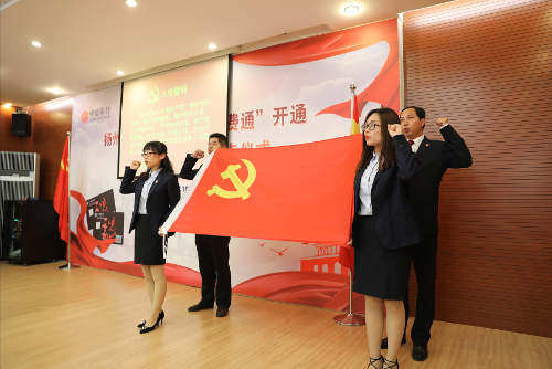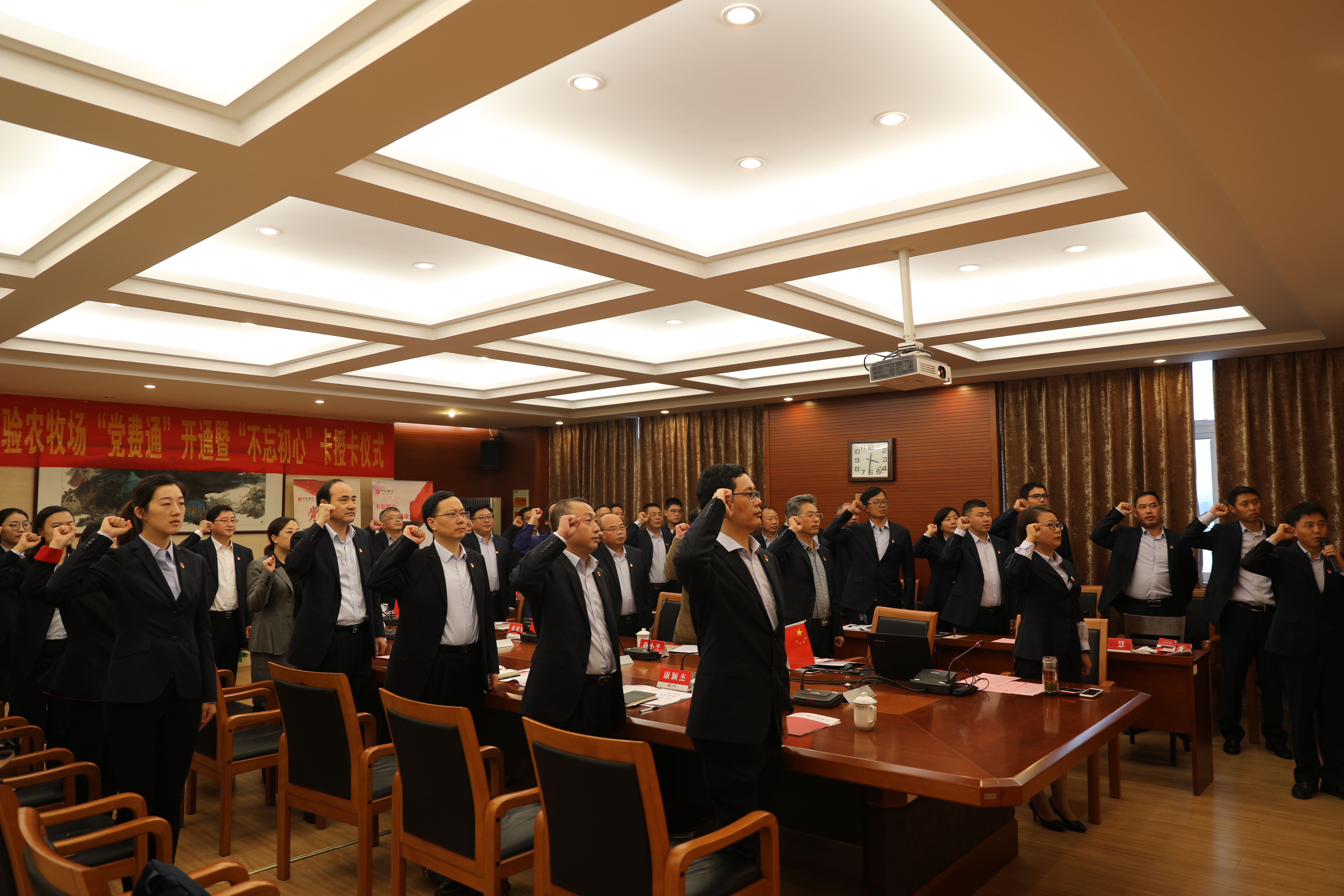 在全体成员收看党费通宣传视频,陈雯解读党费通的使用方法后,薛小平部长宣布实验农牧场“党费通”开通,沈高升行长向张建军书记授“不忘初心”卡。