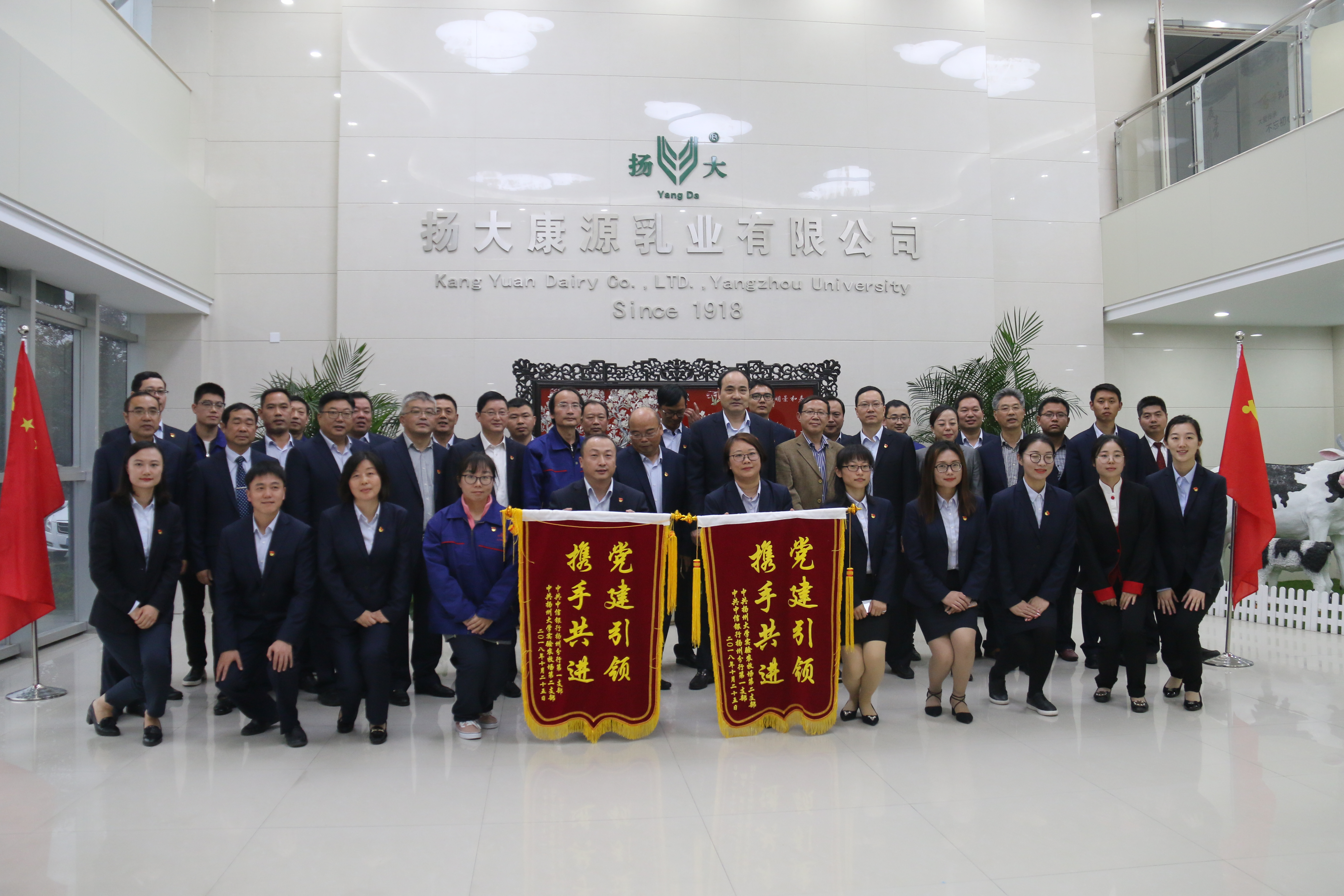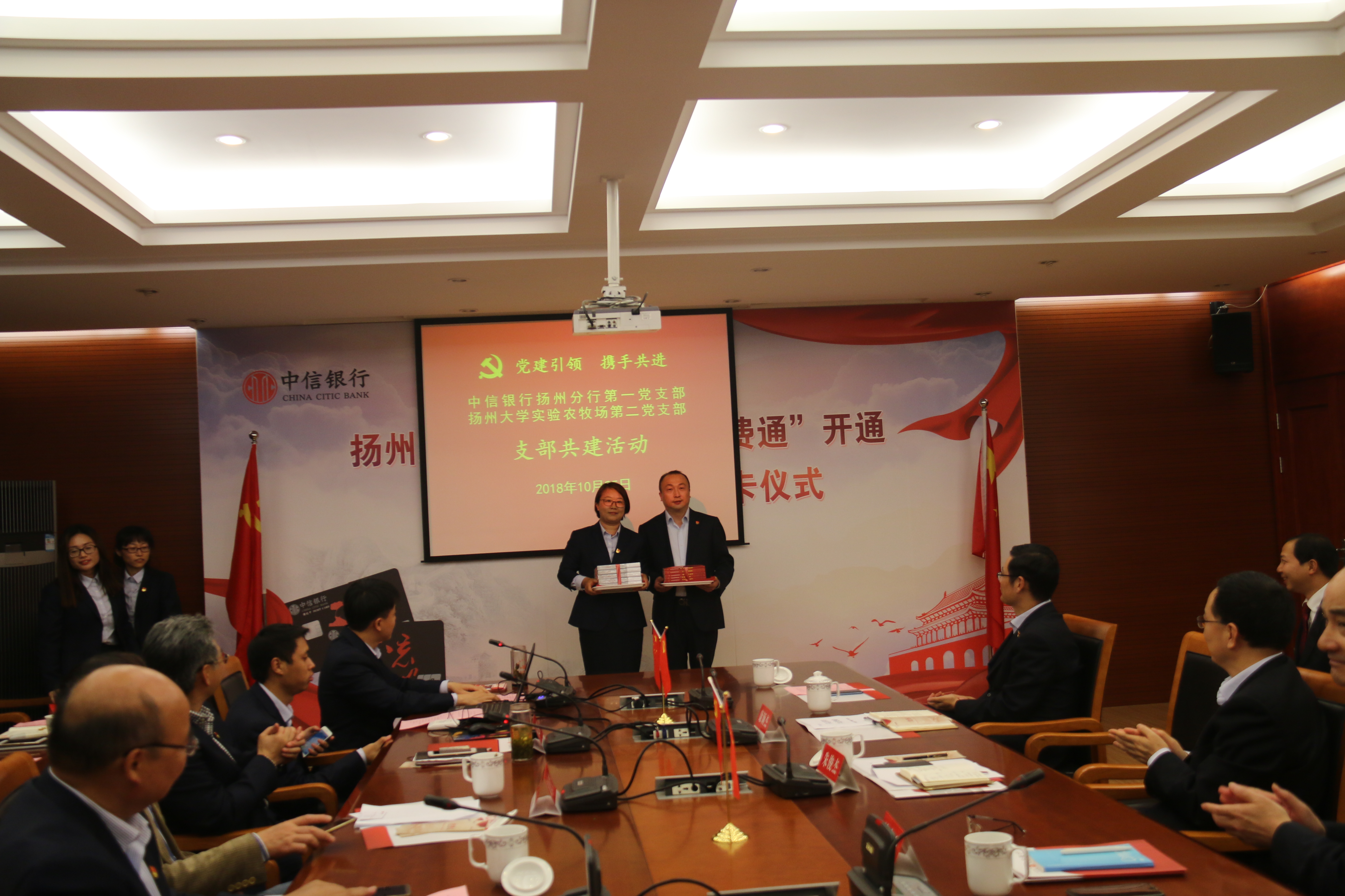 最后,实验农牧场第二党支部书记吴慧和中信银行扬州分行第一党支部书记康颖杰分别代表两个支部围绕“党建引领、携手共赢”主题开展交换锦旗、互赠图书支部共建活动。