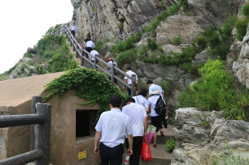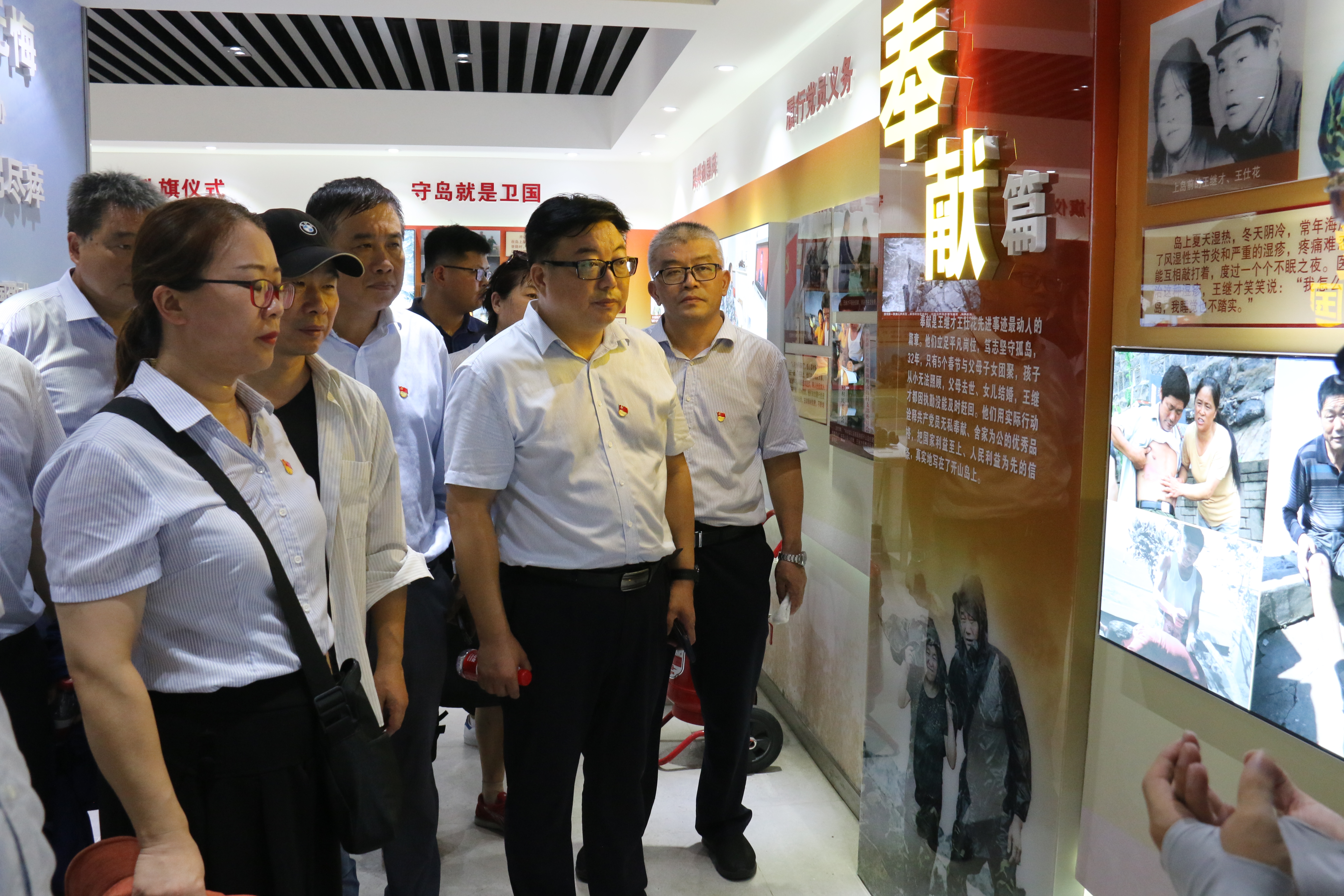 在开山岛上,大家缓步行走在面积仅0.013平方公里的海岛上,这个面积仅有两个足球场大小的黄海前哨,野草丛生,海风呼啸,人迹罕至。王继才、王仕花夫妇从1986年7月至2018年7月为国守岛32年,直至王继才因公殉职。32年来,他们坚定着岛就是家、岛就是国的信念,在台风巨大的冲击中坚守,在孤独寂寞的黑夜中坚守,在夏日高温高湿、冬季寒风刺骨中坚守,上报了许多重要的海防信息,出色完成了战备值勤任务。大家观摩参观王继才先进事迹展馆,端详一张张触动记忆的遗物,重温入党誓词,重走英雄巡岛之路,听着一阵阵海浪拍打礁石的声音。涛拍孤岛岸,风颂赤子心。大家纷纷表示,一定把英雄的事迹装进脑海里,落到行动上,爱国奉献、爱岗敬业、奋斗拼搏。