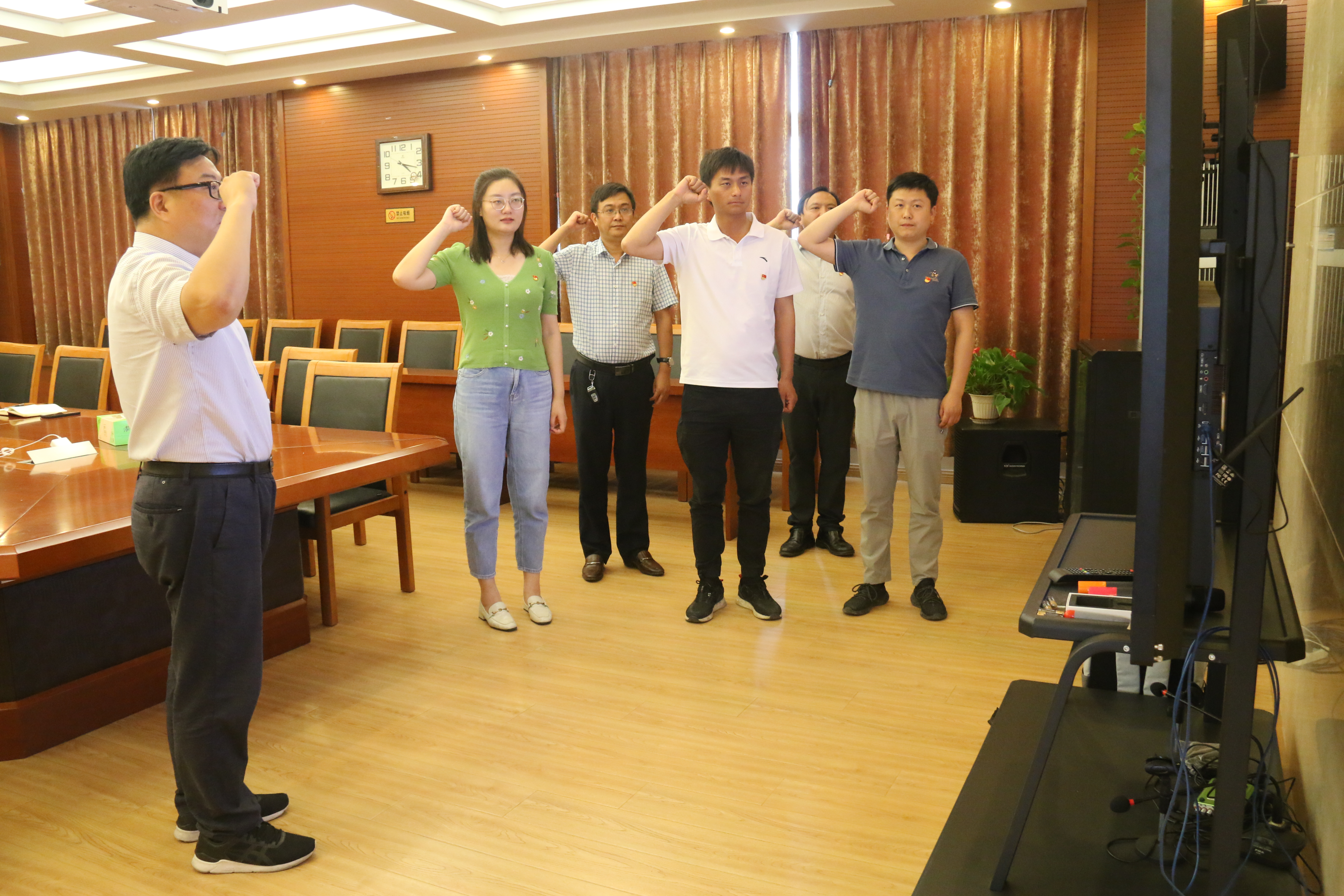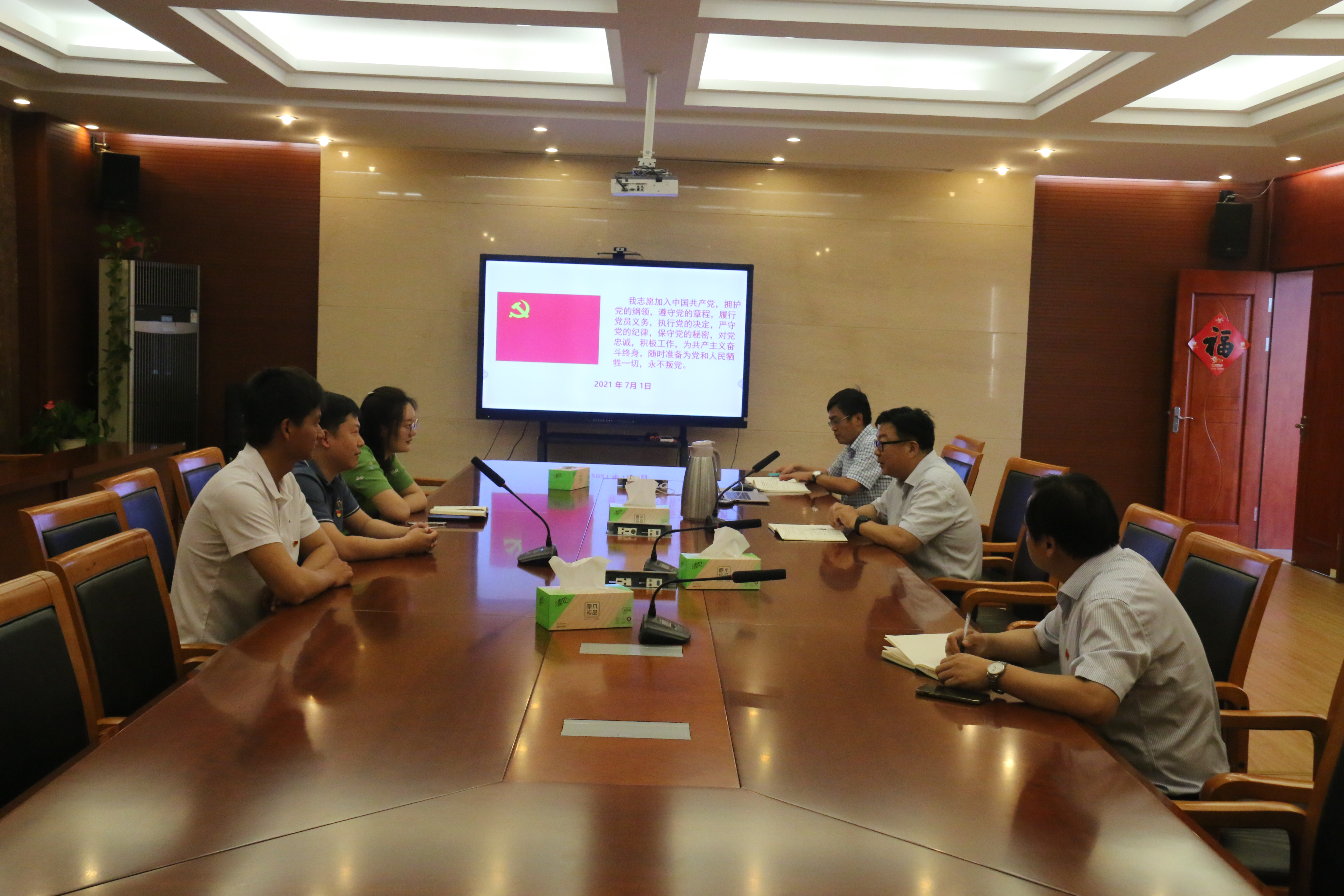 新发展党员在房书记的带领下,神情肃穆、举起右拳,整齐地面向党旗庄严宣誓:“我志愿加入中国共产党,拥护党的纲领,遵守党的章程,履行党员义务,执行党的决定,严守党的纪律,保守党的秘密,对党忠诚,积极工作,为共产主义奋斗终身,随时准备为党和人民牺牲一切,永不叛党。”80字的入党誓词,包含党的性质、宗旨、纲领、目标等,从党的十二大一直沿用至今。铿锵誓言在会议室内久久回荡,让新党员更加坚定牢记自己的庄严承诺,在工作中以人民利益为重,不忘初心,坚守使命,永守入党初心,时刻以党员的标准严格要求自己、时刻以党员的先进性鞭策激励自己,坚定理想信念,履行职责,在工作中贡献自己的力量,以实际行动兑现对党的庄严承诺。
